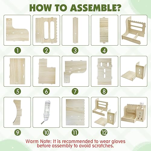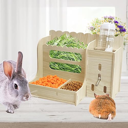 GOOD QUALITY MATERIAL: The rabbits hay rack for cages is made of natural wood for long term use, compared with plastic products, wooden bunny feeder manager are more suitable for small pets' daily feeding, n-atural wood products are better for alleviating pets' negativity in the cage. The water bottle is made of food-grade plastic with gravity flow design to control the amount of water and prevent spillage, the sealed design make sures that your pet will not drip or soak the cage when drinking