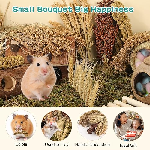 TAOKEKE hamster spray set contains content: you will get Wheat sprays (35sticks), Flax (50g), Yellow Millet (4sticks), Sorghum Millet (25sticks),Rice(25sticks),Panicle(50g),providing safe chewing toys and foraging rich toys for warehouses, sand, mice and other small pets