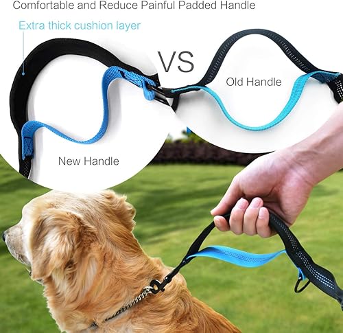 DUAL HANDLES FOR EASY CONTROL: This dog walking leash has 2 handles with soft neoprene padding for easy and comfortable grip. You can quickly grip the handle by your waist to guide dog back on track. Get a more direct control and prevent dog fights with the collar's handle
