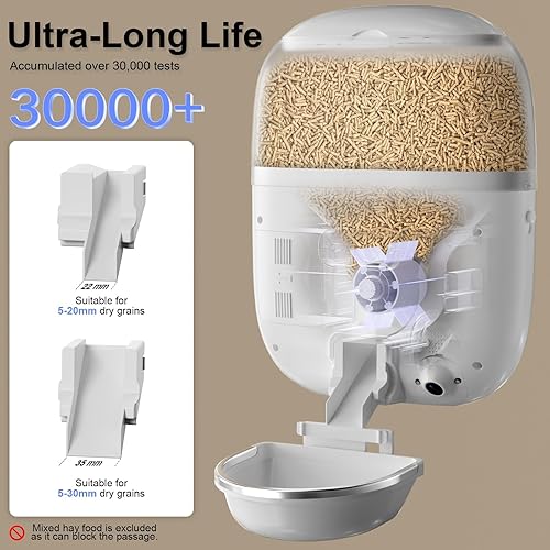 Large Capacity & Anti-Jam Design: Equipped with a 62oz food storage bin and dual outlet ports, Small outlet for 5-20mm pet food and large outlet for 5-30mm pet food. Anti-jam mechanics reduce malfunction risks, while the chew-resistant stainless-steel bowl and sealed desiccant box keep food fresh. Ideal as an automatic feeder for rabbits, guinea pigs, small dogs, birds, and more