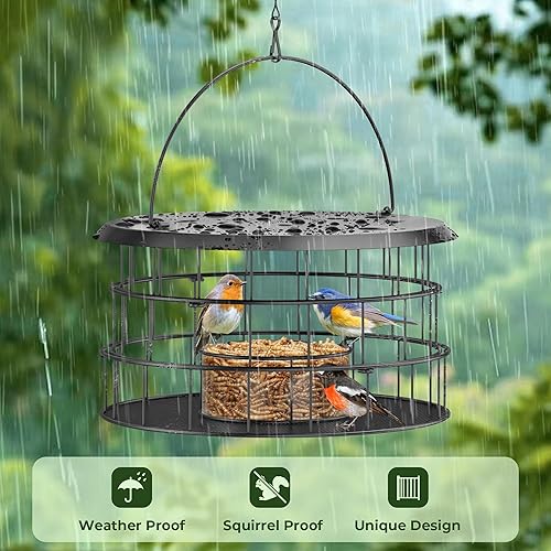 Easy to refill by lifting the lid and filling with bluebirds' favorite foods. Adjustable chain size - The total height of the platform bird feeder is 15 inch with adjustable chain. Wildly in various sizes of space/trees