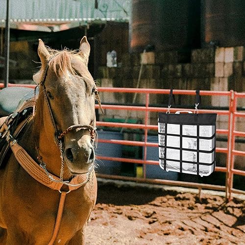 Adjustable Fixation: Box fan hay bag equipped with adjustable hanging straps and reinforced hooks, it can be hung securely on fences, posts or stable walls to prevent sliding or falling off