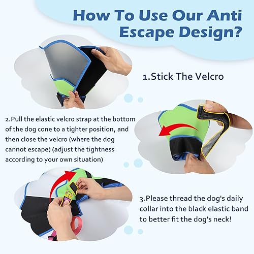 【Great Anti-Fall&Escape Design】---After hundreds of trials by our product development team, we have finally successfully developed the anti escape dog cone with scarf velcro! Different from others with thin drawstring(Effective but has risk of suffocation),Our widened neck velcro not only prevents the dog's neck from feeling pressure, but also effectively prevents escape. In terms of functional design, it can be considered perfect!