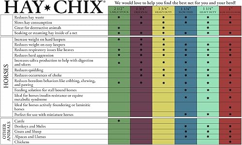 EASY-FILL WITH PATENTED CLOSURE: Featuring the patented Hay Chix Rope & Hoggle closure system, this net is incredibly easy to fill and securely holds 1/2 of a small square bale for convenient feeding. These slow feeder hay nets for horses are simple to use in your daily routine and help get chores done quickly. Fill them, hang them and go.