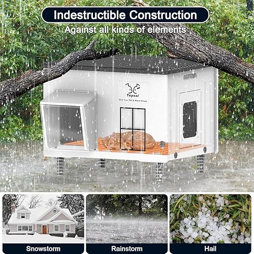 【Heavy Duty Heated Cat House for Outside】Our cozy heated outdoor cat house measures 17.7" x 17" x 17.5", it is the perfect heated home for feral cats, community cats, barn cats and other outdoor cats. Built with a highly robust construction, the house can withstand extreme weather and accidental impacts, ensuring the safety of outdoor pets. if you wanted a cat house with escape door, that is insulated, weatherproof, elevated, and easy to clean, this checks all those boxes.