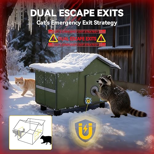 Safety-First Design: Features two exits with heavy-duty magnetic one-way closures that keep predators out while letting your cat escape easily. Built with chew-resistant wiring and an ETL-certified heated pad (auto shut-off for overheating), so your pet stays safe outdoors—day and night.