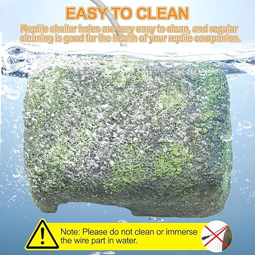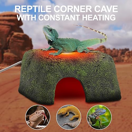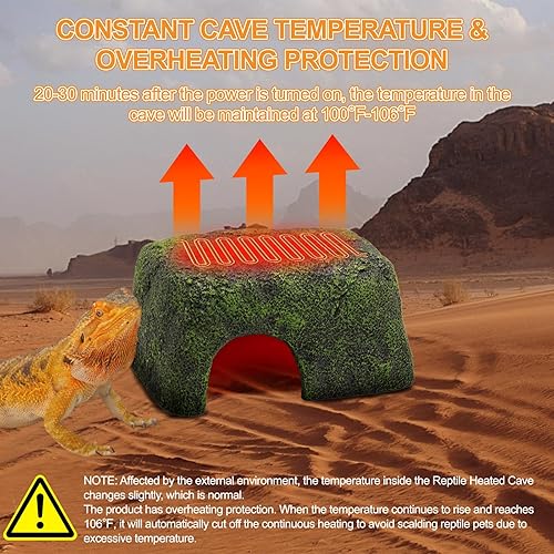 HEATING CONSTANT HIDE CAVE - Reptile heated hide cave temperature in the cave will continue to rise after the power is turned on. Heating continues for 20-30 minutes, the temperature in the cave will be maintained at 100°F-106°F. Constant temperature overheating protection function When the temperature reaches 106℉, it will automatically cut off the continuous heating to prevent reptiles from being scalded due to excessive temperature.