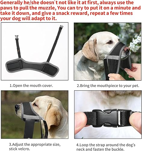 【ADJUSTABLE SIZE】: The adjustable strap connecting to the neck help to keep the dog muzzle securely in place, ensuring it is snug and anti-slipped. Adjustable at snout and neck strap. Keep the muzzle tight enough to control his bite. Attention: picture shows measuring tip of dogs nose, so definitely measure the tip of the snout, not the widest part.