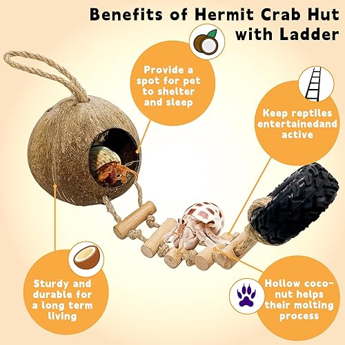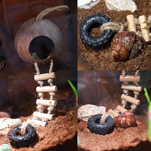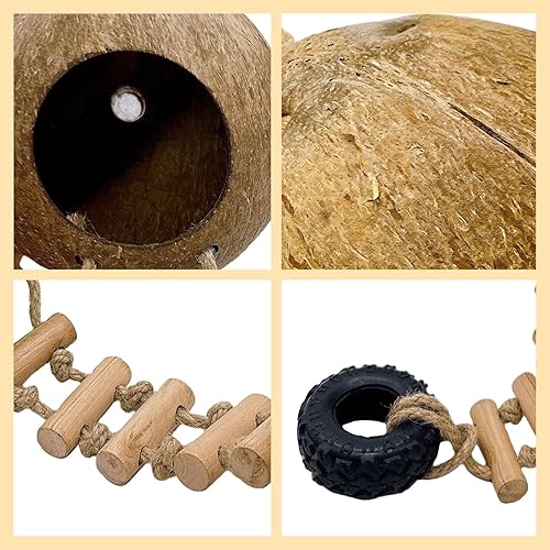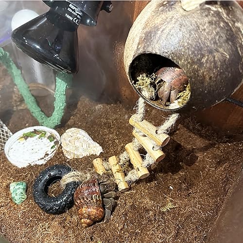[Easy Installation]The reptile coconut shell hideout comes with powerful suction cups to help secure it in place. The ladder is detachable and the coconut shell can also be suspended using a hemp rope, creating a comfortable and challenging environment for your pet. It is an ideal habitat for reptiles.