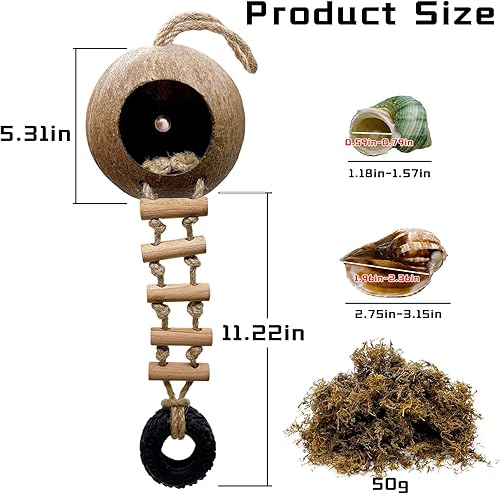 【5 Pack Reptile Coconut Shell Hideout Kit】You will receive 1 x Reptile Coconut Shell Hiding and Climbing Ladder + 50g Moss + 1 x Thick Sisal Rope + 2 x Sea Shells. Detailed specifications: coconut shell diameter: 5.3 inches, opening diameter: 2.36 inches, ladder + wheel size: 11.22 inches. This coconut shell hideout provides a cozy and warm environment for your reptile.