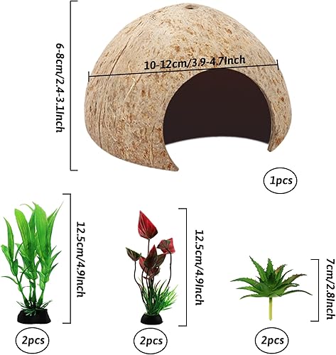 Hermit Crab Supplies Package includes: 1 x Natural coconut shell hideouts, 15 x hermit crab shell and 6 x Artificial Plants.