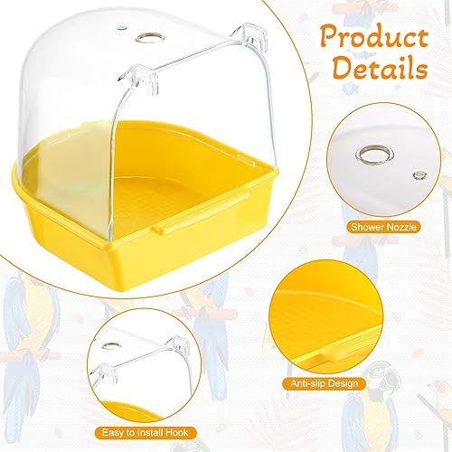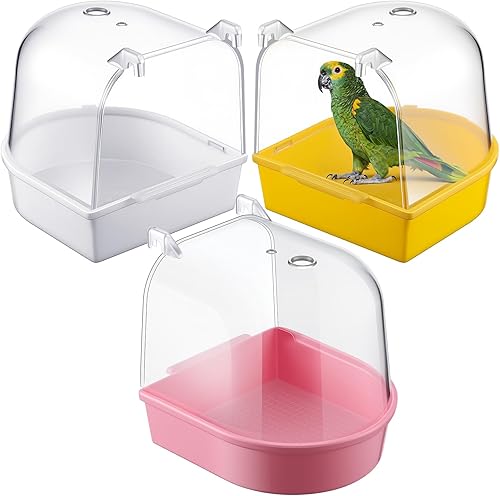 3 Colors and Quality Material: the package contains 3 pieces of parakeet bird bath boxes in 3 different colors, including yellow, pink and white with transparent cover; They are made of quality plastic, which is rugged, safe and friendly to your adorable birds