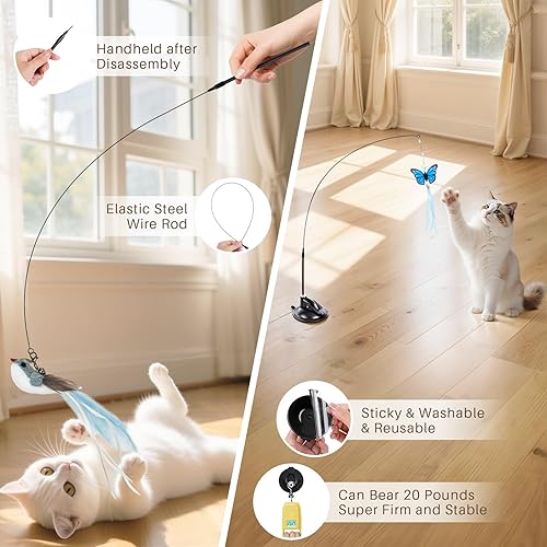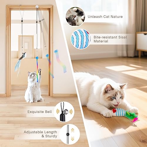 14 Pcs Cat Teaser Toys: The set includes 1 single-end suction cup, 1 double-end suction cup, 2 cat wands, 4 feather toys, 4 worm toys, 2 butterfly toys, 2 mouse toys, 2 ribbon toys, 2 ropes, 2 sticky pads and 1 triangle clip. All parts are detachable and feature a detailed bell to stimulate your cat's hunting instincts, give your cat some exercise, and help keep a bored cat interested!