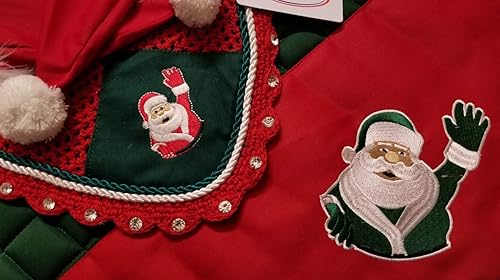 Horse Christmas Santa Claus Saddle PAD Set with Matching Fly Bonnet Ear NET Cotton Hand Made Crochet Fly Veil Hood MASK Equestrian Shows Breathable Cotton (Full/Horse)