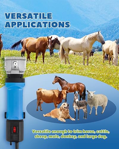 [690W HIGH POWER]: 690W high power motor made of high temperature resistant all copper wire set with 2800RPM speed, featuring ultra-low power consumption, ultra-high temperature resistance, powerful output and long machine life. Tailored to meet the needs of a farm, this heavy duty horse clipper can handle 3-5 horses per hour, and is versatile enough to trim cattle, sheep, mules, donkeys, and large dogs. For small cats, dogs and other small animals, we do not recommend using this clipper.