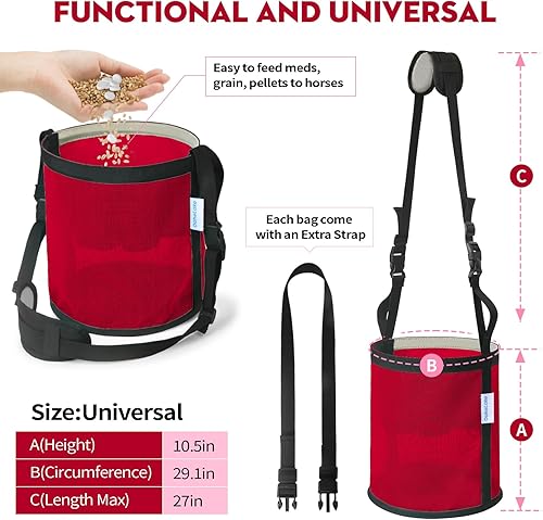 UNIVERSAL SIZE & NO HASSLES: OaheLake horse feeding bag has One universal size, 2 adjustable straps provide an fully adjustable fit for most of horses. No hassles, Get 2 bags ➕2 extra straps included in one purchase. Contact OaheLake for assistance if any concerns arise.