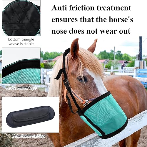 Adjustable Strap and Comfortable Neck Pad:An elastic strap with adjustalbe pad better suits most horse's mouth and head when in motion, the bag draws in as the feed is eaten by the horse without causing any discomfort. Not easy to fall off once fixed in place,Adjustable elastic straps with quick-release buckles fit mini to draft horses, while nose/neck pads reduce friction in horse feed bags with mouth cover,prevents suffocation—essential for horse feeding supplies.