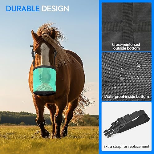 【EASY TO WEAR AND CLEAN WITH ADJUSTABLE STRAPS】: This equine feedbag uses an adjustable strap to go around the horse's poll to hang on the muzzle, it has quick-release buttons on both sides. Whether you're left-handed or right-handed, it's extremely convenient to use, and easily adjust to best fit different horse sizes. Mesh is easy to clean, just spray with a hose and hang to dry.