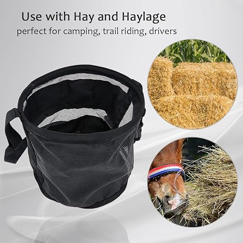 9" depth. No grain is wasted with a spillproof design. Use with hay and haylage, perfect for camping, trail riding, drivers.