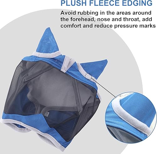 【FLEECE PADDING EDGING】Soft fleece edges can prevent rubbing along the forehead and around the nose and throat. It can minimize rubbing and reduce gaps, ensuring this horse flymask is exceptionally comfortable to wear