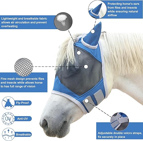 【RELIABLE PROTECTION】The durable fine fly masks for horses which keep horse have clear vision while being ultra-breathable. Eye darts lift mesh design protects horse’s face and eyes from flies and insects, This equine fly mask with ears won’t rub or cause harsh abrasions