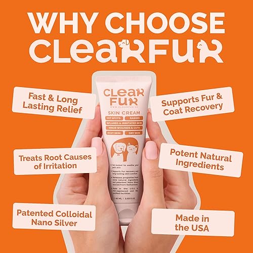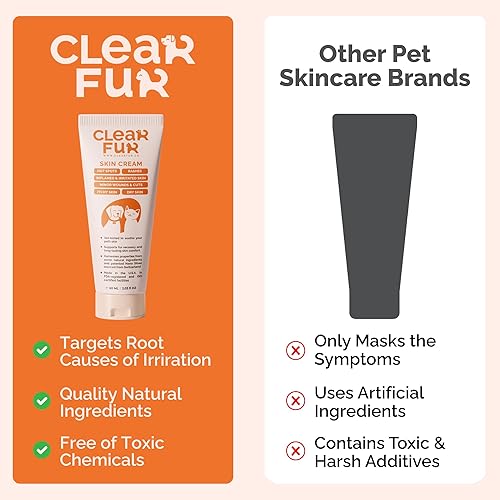 FAST-ACTING RELIEF WHILE TREATING THE SOURCE: Experience immediate relief for your pet’s irritated skin with ClearFur Skin Cream. Our advanced formula swiftly soothes hot spots, itchy and inflamed skin, rashes, flaky patches, burns, bug bites, sores, minor wounds, and cuts. The fast-acting properties of ClearFur Skin Cream not only alleviates biting and scratching but also ensures a rapid recovery with its lick-resistant, non-toxic ingredients. More than just a quick fix, ClearFur Skin Cream addresses the root causes of skin irritation, promoting comprehensive healing and restoring your pet's skin to its healthiest state.