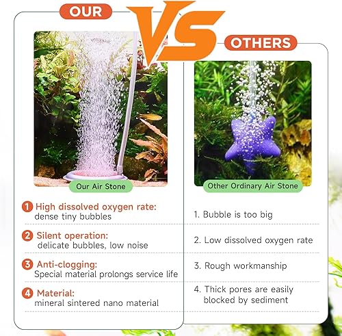 High Dissolved Oxygen Rate: The blue control valve allows you to adjust the intensity of air bubbles. Fish tank bubbler can release smaller, denser and more uniform bubbles, increase oxygen levels while reduce carbon dioxide levels, and raise the pH value. Ultra-fine pore design, even after a period of time, will not cause a decrease oxygen released due to floating objects in the water clogging up the pores.
