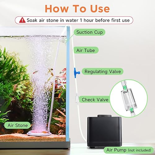 Air Stone Kit Accessories Included: The air stone kit comes with air disk stone * 1, air tubing * 1, control valve * 1, check valve * 1, suction cup * 1, T-shaped connector * 1, user manual * 1. Fit for hydroponic systems, small ponds, aquariums or fish tanks. TIP: Soak the stone completely in water for 1 hours before use to ensure optimal performance.