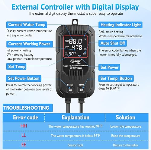 Full Protection for Submersible Aquarium Heater: ①Off-Water Warning: when the heater leaves the water, it will automatically cut off the power to prevent dry running; ②Over-temperature Warning: when the water temperature exceeds 94°F, the heater will automatically stop heating to prevent boiling fish; ③Low-temperature Warning: when the water temperature is below 59°F, the heater will sound an alarm and continue heating. Error Code: HH-High temp.; LL-Low temp.; Auto shut off- Out of water
