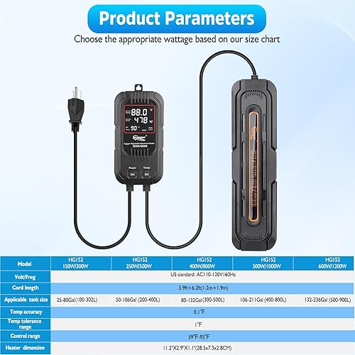 Fully Equipped with Warranty: Package includes: 1 heater, 1 controller, 3 suction cups, 1 controller holder and 1 hook. Heater length: 11.2 inches, Power cord length: 3.9ft + 6.2ft, Voltage: 110-120V. The 150W/300W fish tank heater is suitable for 25 to 80 gallon saltwater and freshwater aquariums. Perfect for fish tanks, turtle tanks, small ponds, etc. It also includes a 12-month warranty for your peace of mind.
