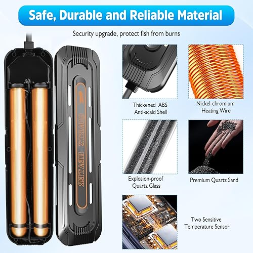 Fast Heating and Energy-saving Frequency Conversion: This hygger fish tank heater is made of high-temperature resistant nickel-chromium heating wire and explosion-proof quartz glass, which heats up quickly and has a long service life. The sturdy ABS shell protects the fish from scalding. When the water temperature is lower than the set temperature, the heater heats at full power, when reaches the set temperature, the heater maintains the temperature at low power. Saving energy and electricity