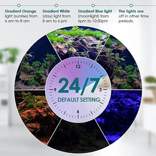 DEFAULT MODE(24/7 Natural Mode): Gradient Orange light (sunrise) from 6 am to 8 am; Gradient White light from 8 am to 6 pm; Gradient Blue light (moonlight) from 6 pm to 10:50 pm; The 24/7 lighting aquarium lights are off in other time periods. The overall default time period can be delayed or advanced