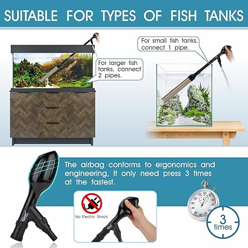 SIPHON WORKING PRINCIPLE: No need to be plugged in(electricity), manual operation, by testing at the fastest it only press 3 times, and the water can be auto flowed, complete the water circulation from the inside of the tank to the outside, and take away the impurities on the sand and gravel through the water flow