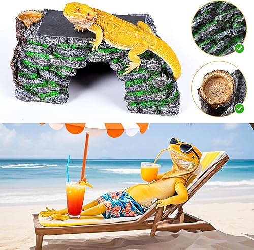 [3 in 1 Basking Platform] Bearded Dragon Basking Platform size is 13.4x7.1x5.3 inch with Tortoise slate is made of slate stone material with natural texture on the surface and simulating nature tree hole bowl.Rock formations are a naturalistic decorative design. Maximize the simulation of reptiles natural habitats, in line with their wild climbing habits. Suitable for reptiles such as bearded dragon, gecko, lizards, etc.