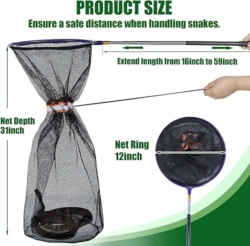 HEAVY-DUTY TELESCOPIC POLE: Equipped with a reinforced stainless steel telescopic pole that extends from 16 to 59", ensures a safe distance when handling snakes. The snake catcher net and pole are separate, when not in use, the pole can be collapsed to a compact size for easy storage.