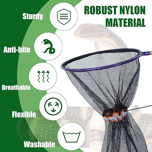 STURDY AND DURABLE NET: The snake catching net made from robust nylon, ensures long-lasting use. The 12-inch wide net ring facilitates easy placement of the snake, while the 31-inch depth provides ample space for secure containment. The middle drawstring effectively traps the snake at the bottom.