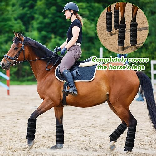 Convenient Straps: the horse leg wraps measure about 16 x 17 inches, providing full coverage for the horse's leg; It features a self-adjusting fit system combining hook-and-loop fasteners and elastic straps, allowing flexible tightening according to the leg's contours for a secure fit; This design not only makes it easy to put on but also enables versatile application on the horse's back, lower legs, hocks, thighs, and other muscle and joint areas, making it a multi-functional solution