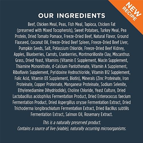 NATURAL INGREDIENTS: This grain free dog food uses the pure, real nutrition of raw meat and whole food ingredients. This dry dog food contains no grain, potato, corn, wheat, soy, by-product meals, artificial colors, or preservatives.
