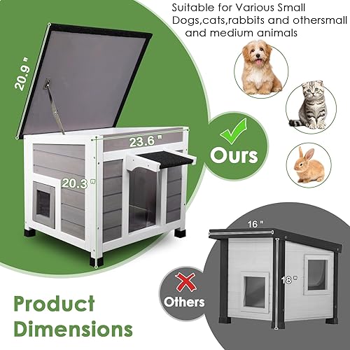 Elevated by 4 Plastic Footpads: With 4 elevated plastic footpads, the outdoor cat house is lifted off the ground. This design protects it from moisture and small insects, creating a dry and comfortable environment for your cat. It also helps to extend the lifespan of the cat house by preventing direct contact with damp ground