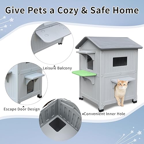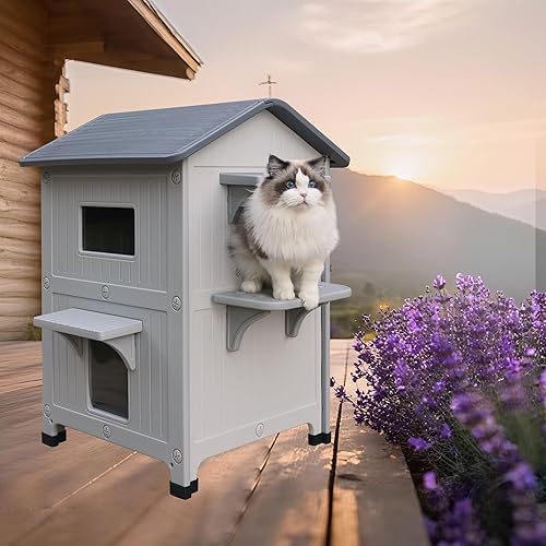 Great for multi-cat households: Internal space measures 33.8''x21.5''x21'', Two Story Outdoor Cat House with Balcony offers a large feral villa cat shelter, perfect for multiple cats