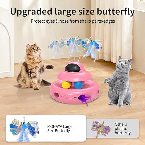 Fun to play :MOHAYA's random tracks, unpredictable movements stimulate the cat to chase and play. Encourage your cat to pounce. Balls stimulate your cat's senses, and random fluttering butterflies encourage it to chase. Feathers emerge randomly from six holes, sparking their hunting instincts.