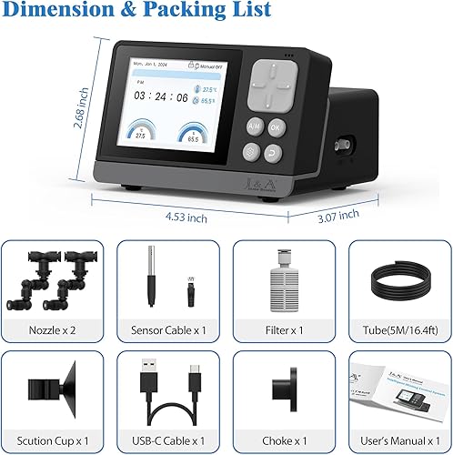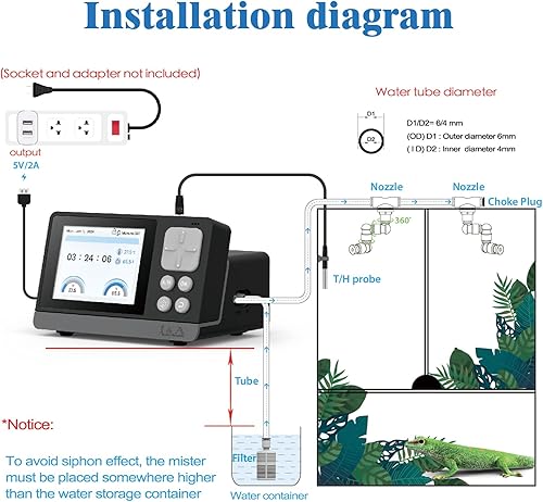 What You'll Get: The terrarium misting system comes with Controller x1, T/H sensor probe x1, Sensor probe suction cup x1, Filter x1, Tube(16.4ft) x1, Nozzle x2, Choke plug x1, USB-C cable x1, User’s Manual x1