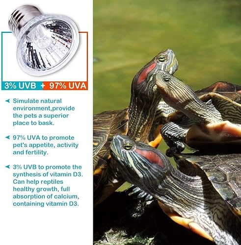 ★Full Spectrum. (97%) UVA stimulate the appetite, activity and fertility, (3%) UVB promote the synthesis of vitamin D3. Can help the healthy growth of reptiles, fully absorb calcium, containing vitamin D3.Reptile easily placed in a variety of environments. Visible light to create a natural effect, promote the formation of D3, adequate absorption of calcium, helping to climb pet healthy growth.
