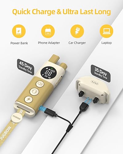 Fast Charge & Long Battery Life - The dog correction collar spend more time training and less time charging. 2 hours fast charging with 2-in-1 charging cable provides up to 35 days of standby on the receiver and 45 days on the remote, perfect for families travels, outdoor adventures, or multi-day camping trips