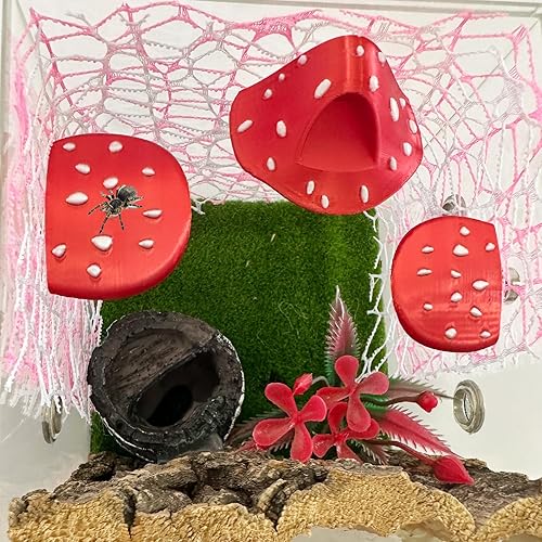 【Fairy Tale Terrarium Aesthetic】The mushroom platforms and soft-colored webs bring a charming, whimsical style to your spider's space. Their vivid red caps with white spots, paired with fluffy pink and white webs, create a dreamy, storybook-like scene inside any enclosure