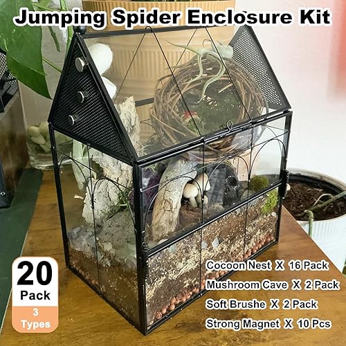 Jumping Spider Enclosure Accessories: Natural silk cocoon huts and resin mushroom caves are jumping spider friendly, and jumping spider habitat will attract spiders or praying mantis to hide in it, providing them with a comfortable and cozy place to play, rest, snooze, forage, feed, breed or just hang out
