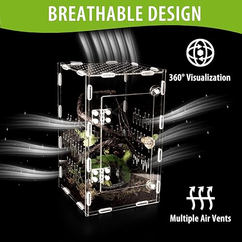 【 Clear Vision 】The overall design of this reptile terrariums adopts a fully transparent visual effect, allows for a 360°clear observation of your pet's life dynamics. Holes on sides and top can maintain free air circulation, ensuring smooth breathing and natural living atmosphere
