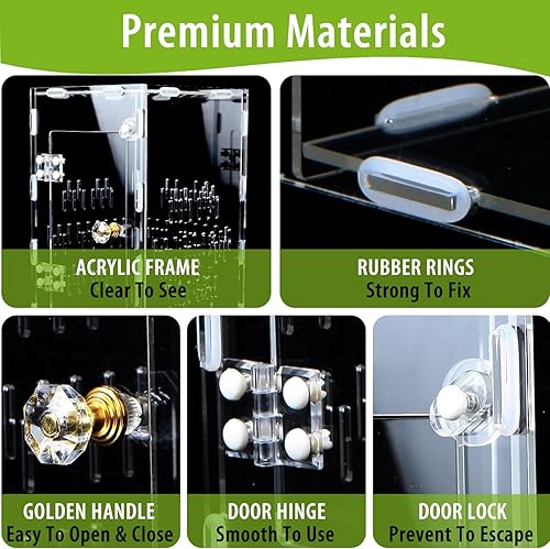 【 Premium Material 】This spider enclosure is crafted from high-quality acrylic plastic, reliable and sturdy to service for long time.High elasticity rubber rings can seal the whole cage well, and the double insurance of two locks on the upper and lower of the door prevent pets from escaping