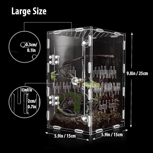【 Large Space 】Our jumping spider enclosure is measured at 9.8"H*5.9"L*5.9"W and features air holes with a width of 0.12 in, providing enough vertical living space for your reptiles pet like large spiders to enjoy and explore.Front door opening is convenient for daily feeding and cleaning
