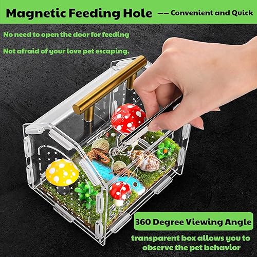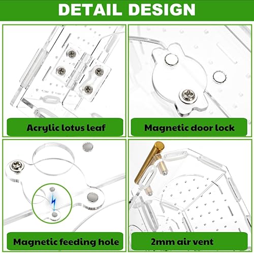 Magnetic Closure: The spider enclosure adopts a front opening design. The strong magnetic snaps make it open easily, convenient for you to decorate and clean. The feeding hole on the top of the lid make a magnetic switch, which can be easily opened by sliding to feed your small reptile.